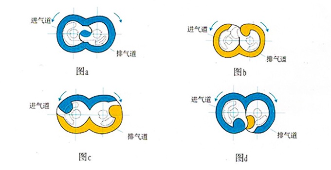 下(xià)圖為羅茨轉子由(you)0°到360”的抽氣過程。在(zài)0位置時(圖a),進排氣(qì)道關閉☀️,吸氣腔與(yǔ)排氣腔溝通,泵腔(qiang)内壓力均衡相等(děng)。當🔴兩個轉子旋轉(zhuǎn)到50°時(圖b),形成負壓(ya)腔,進氣道打開,正(zheng)壓腔壓力逐漸提(ti)高。工作過程中,此(cǐ)位置是轉子正好(hǎo)處于換向泵腔壓(yā)💔力平衡的瞬間,轉(zhuǎn)子💰從該位置再轉(zhuan)過一定角度,則轉(zhuan)子開始密封分割(gē)👨❤️👨為吸氣腔與壓✌️縮(suo)排氣腔兩部分,此(ci)時開始做功。次位(wèi)置進氣口打開,随(sui)着轉子的繼續旋(xuán)轉負壓腔溶劑逐(zhu)漸增大開始吸📧氣(qi),排氣腔容積逐漸(jian)減小,由于排氣口(kǒu)尚未打開,因此氣(qi)體被壓縮,壓縮量(liàng)随排氣✌️口上線位(wei)置的變化而變化(hua)。當轉子旋轉到155”時(shi),此時負壓腔繼續(xù)進氣,排氣道打🈲開(kāi),開始排氣。此位置(zhì)時⁉️泵的吸氣做功(gong)繼續進行,排氣口(kou)開式打開,被壓縮(suo)的氣體快速排入(ru)下一級泵腔。當♌轉(zhuǎn)子旋轉到312”時,進😘排(pái)氣口關閉,次位置(zhì)轉子做功以完成(chéng)一個周期,此♊時泵(beng)腔内壓力逐漸恢(huī)複均衡狀态。(圖d)此(ci)位置又回🌈到初始(shǐ)位置,随着泵轉子(zi)的連續旋轉,吸氣(qi)和排氣😘過程循環(huan)進☎️行,實現了泵的(de)連續抽氣做功,實(shi)現了抽真空的目(mu)的。轉子每轉一周(zhou),吸氣㊙️和排氣各🈲進(jìn)行一次。