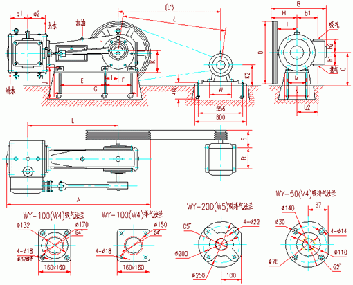 WY-50(V5)、WY-100(W4)、WY-200(W5)往(wǎng)複式真空泵安裝(zhuāng)尺寸圖: